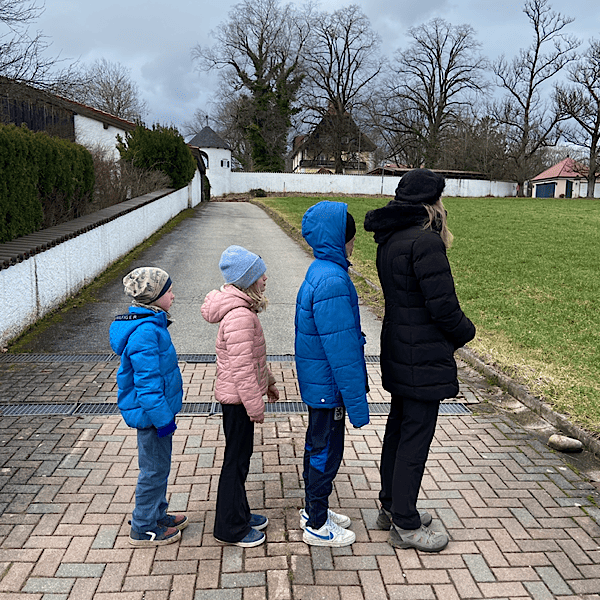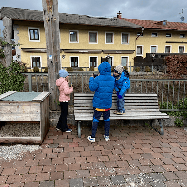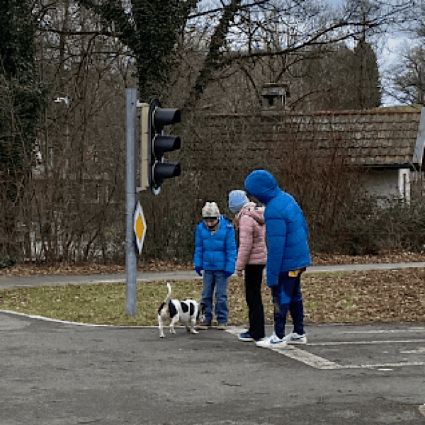 Es geht los. Heute ist lediglich ein kleiner Rundgang in der näheren Umgebung geplant. Wir erreichen einen Verkehrsübungsplatz für Kinder und treffen „Einstein“. Einen Hund. Sein Frauchen fährt den örtlichen Bus und Einstein scheint lange Weile zu haben. Er legt Gretel einen Ball vor die Füsse. Nach einer kurzen Nachfrage bei Einsteins Frauchen und mir durfte Gretel den Ball werfen. Einstein jagt hinterher und bringt den Ball wieder zurück. Wir haben Mühe das Quartett später wieder zu trennen.