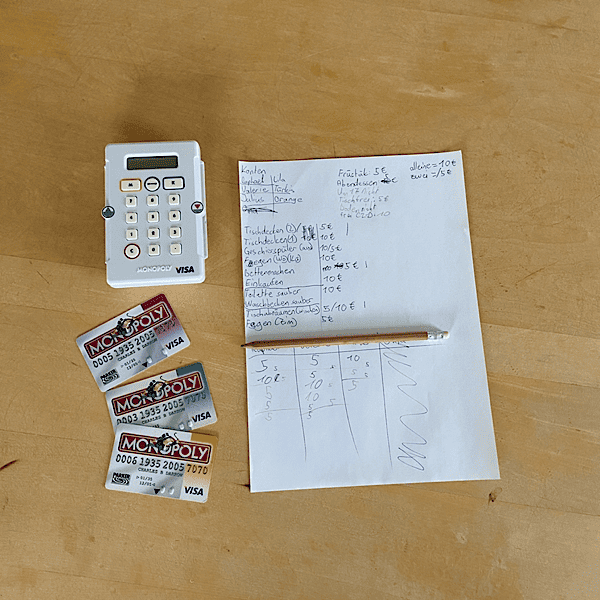 Hänsel hat ein Monopoly-Spiel entdeckt und hat eine tolle Idee, wie die Hausarbeit aufgeteilt werden kann. Für verschiedene Tätigkeiten gibt es eine bestimmte Anzahl von Punkten. So wird das Ausräumen des Geschirrspülers zum Beispiel mit 10 Punkten belohnt. Räumen zwei Personen den Geschirrspüler aus, gibt es für jeden fünf Punkte. Pro Tag werden mindestens 10 Punkte vom Konto abgebucht. Chefbuchhalter Hänsel wacht akribisch über die Konten und bucht jeden Vorgang auf die jeweilige Debitkarte.