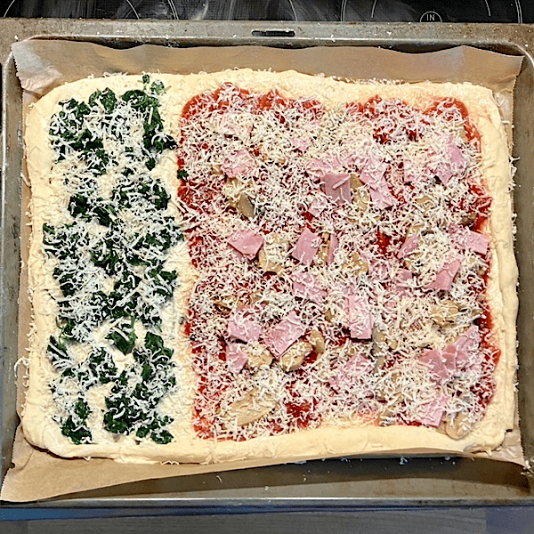 Zu einem Drittel mit einer Käse/Sahne-Soße und Spinat und der Rest mit Pilzen, Schinken sowie Tomatensoße belegt. Frisch geriebener Parmesan oben drauf.
