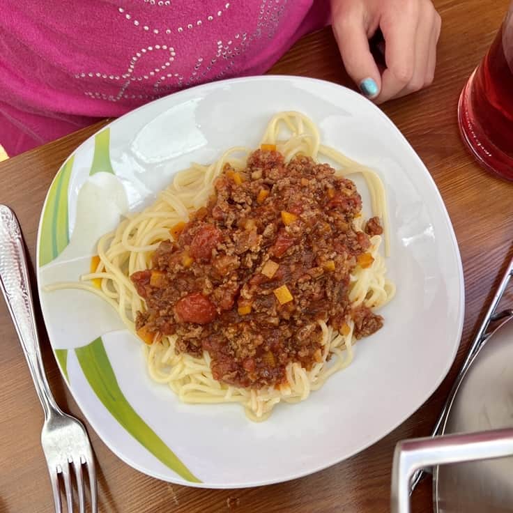 Hand aufs Herz. Wer mag Spaghetti Bolognese nicht? Wir kennen niemanden. Und Großeltern und Enkel mümpfeln ordentlich was weg. „Brudi“ kriegt seine Bolognese so, wie er sie mag, vegetarisch. Das Bild zeigt die nicht vegetarische Variante.