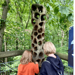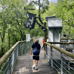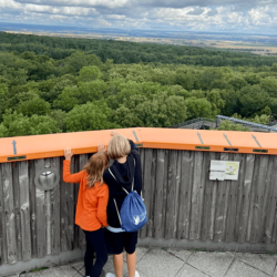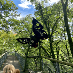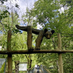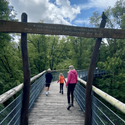 Im ersten Anlauf haben wir leider kein Glück. Ein Anruf bei der Parkverwaltung bestätigt uns zwar, dass der Baumkronenpfad geöffnet ist. Bei unserer Ankunft aber heißt es, er sei wegen des Sturms derzeit geschlossen. Auch die angekündigte Öffnung in zwei Stunden verschiebt sich auf den nächsten Tag. Also schauen wir uns die beiden Ausstellungen im Eingangsbereich an und unternehmen anschließend eine Wanderung durch den Wald. Wir entscheiden uns für den Rundwanderweg mit dem Symbol eines Eichenblatts. Er geht über knapp vier Kilometer und führt uns durch einen Streckenabschnitt, in dem sich neben einer Wald-Symphonie, einem Wald-Blick und vielem mehr auch ein Wald-Geist befinden soll. Dem Wald-Geist sind wir leider nicht begegnet.