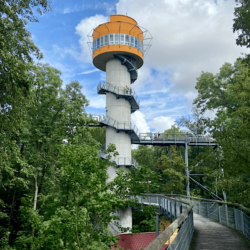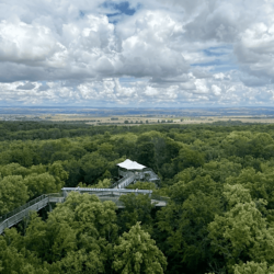 Der Pfad selbst schlängelt sich tatsächlich durch die Baumwipfel hindurch. Klar, dass bei Sturm sicherheitshalber der Zugang versperrt bleibt. Das Highlight aber ist der 44 Meter hohe Turm. 341 Stufen insgesamt müssen erklommen werden, damit man einen grandiosen Blick weit über das Land genießen kann.