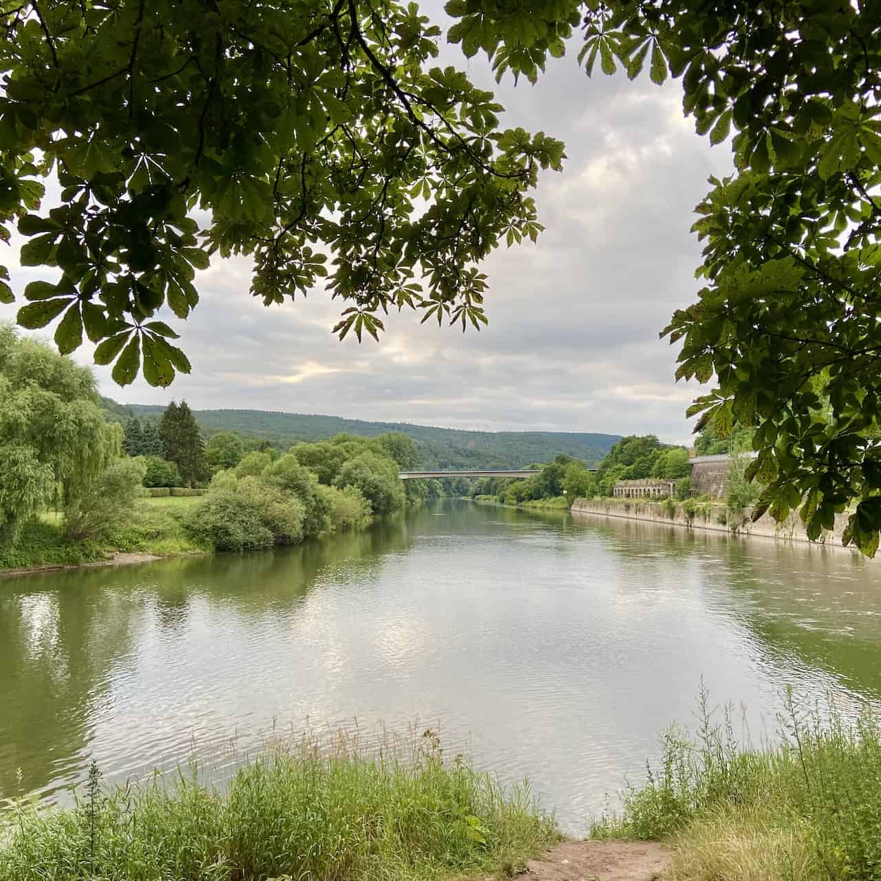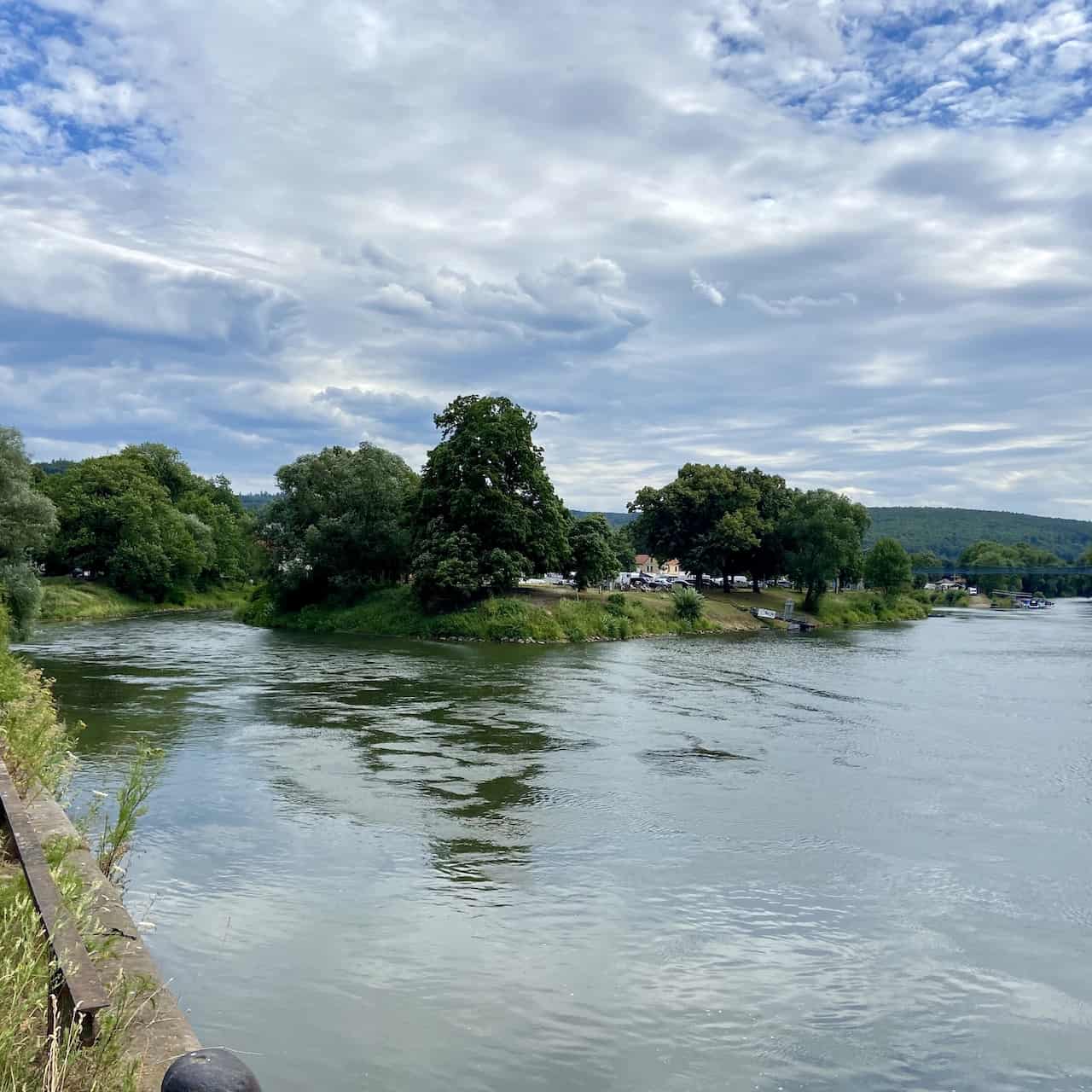 Kaum in HMÜ (sprich: Ha-Müh) angekommen machen wir uns auf den Weg zum Drei-Flüsse-Eck. „Wo Werra sich und Fulda küssen, sie beide ihre Namen büssen müssen“, steht auf einem Stein am Ursprung der Weser geschrieben. Man kann nun wehmütig auf das Wasser schauen, wir aber finden es schön hier unter der riesigen Kastanie umgeben von drei Flüssen. Es entsteht etwas Neues, die Weser. So ist es nun mal im Leben.